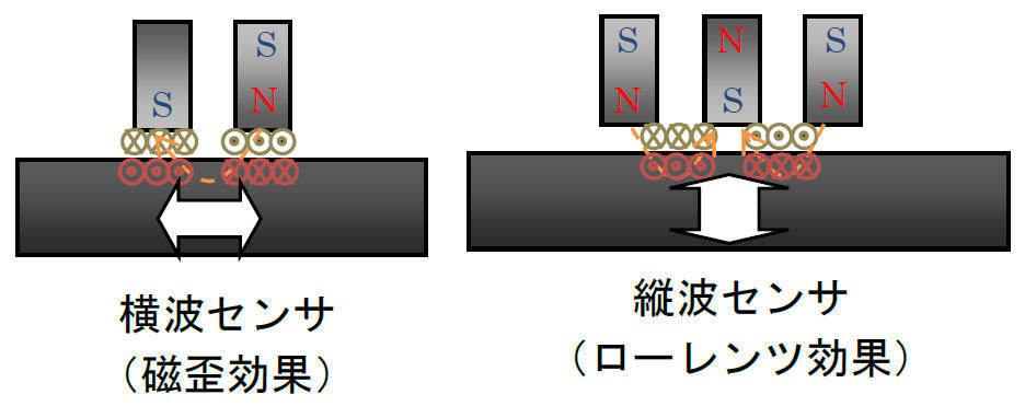 本手法で用いている電磁超音波とは、永久磁石による静磁場(直流磁場)とコイルによる交流磁場(渦電流)を組み合わせることにより、各種超音波を発生させる方法です。
