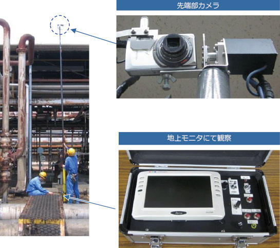 本技術は、地上から見えない高所(ラック上配管など)の点検・目視検査に使用します。リアルタイム映像を確認できるほか、高解像度の静止画を記録することができます。